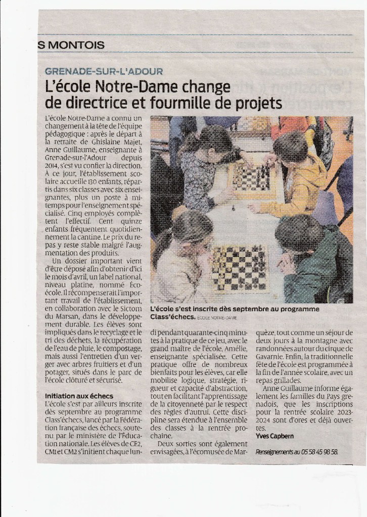 Inscrite au programme « Class’échecs » lancé par la Fédération Française des Echecs, et soutenu par le Ministère de l’Education Nationale, l’école propose, gratuitement et sur temps de classe, de la maternelle au CM2, une initiation aux échecs. Toutes les enseignantes ont été formées à ce jeu.